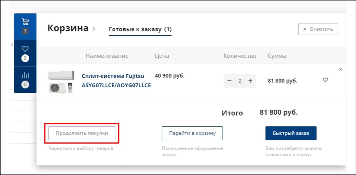• вернуться к покупкам, нажав кнопку «Продолжить покупки»